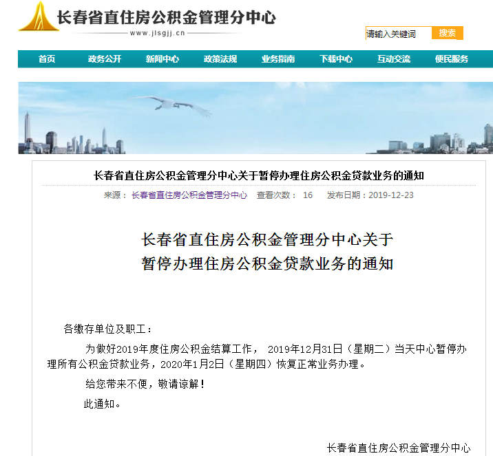 31日长春省直住房公积金管理分中心暂停办理所有公积金贷款业务