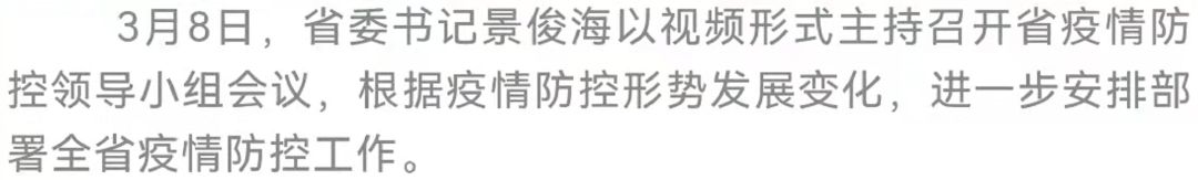 3月8日,省委书记景俊海在北京以视频形式主持召开省疫情防控领导小组会议,根据疫情防控形势发展变化,进一步安排部署全省疫情防控工作。他强调,要切实把思想和行动统一到习近平总书记关于疫情防控的重要讲话重要指示精神上来,按照全国疫情防控电视电话会议和孙春兰副总理部署要求,坚持守土有责、守土负责、守土尽责,不折不扣落实好各项工作举措,牢牢掌握主动权,织密扎紧防控网,尽快实现社会面清零见底,坚决打赢这场保卫战歼灭战阻击战。