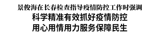 检查指导中,景俊海强调,当前,长春本轮疫情防控正处在关键阶段。长春各级领导干部要保持“时时放心不下”的责任感,以人民为中心,全面落实“快准严细实”要求,深入基层、深入一线做好群众思想工作,既要筑牢科学精准、切实有效的疫情防控屏障,又要铸就齐心协力、众志成城的强大精神防线。要坚持防控工作稳中求进、防控政策持续优化,在隔离转运、核酸检测、医疗服务、疫苗接种、服务保障企业和校园疫情防控等方面采取更为有效举措,确保取得扎实成效。要科学划定风险区域,封控管理要快封快解、应解尽解,最大限度减少因疫情给群众带来的不便,尽快恢复正常生产生活秩序。要关心群众、尊重群众、帮助群众、引导群众,及时回应解决群众合理诉求,充分体现人文关怀和人间大爱,以实实在在的工作成效暖人心、聚民心、强信心。要严防疫情防控各环节安全风险,依法依规维护防疫秩序,切实维护社会大局稳定。