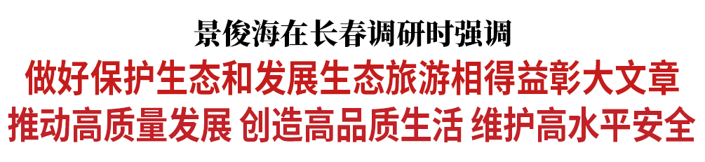 调研中,景俊海强调,做好保护生态和发展生态旅游相得益彰这篇大文章,是深入贯彻习近平总书记视察吉林重要讲话重要指示精神、建设生态强省、满足人民群众对美好生活向往的重要举措。要持续深入推进污染防治攻坚战,高标准严要求做好各项工作,切实让人民群众呼吸清新空气、喝上干净的水、吃上放心粮食。要持续深入推进山水林田湖草沙一体化保护和修复,加强江河湖泊生态环境系统治理、综合治理、协同治理;对破坏生态环境的行为要严厉惩处、绝不手软,坚决守住生态安全底线。要持续深入推进生物多样性保护,更好实现人与自然和谐共生。要持续深入推进生态旅游发展,充分兑现吉林优质生态资源价值。