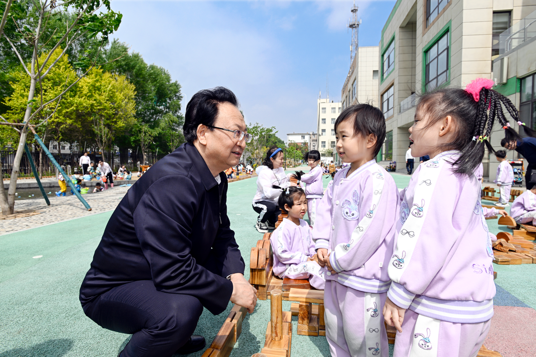 长春市实验幼儿园是我省首批省级示范性幼儿园。操场上,孩子们正在老师带领下快乐游戏,阵阵欢声笑语充满校园。景俊海刚刚走进幼儿园,孩子们就围了上来,争相邀请他一起搭积木、做游戏。看到一张张稚气笑脸天真可爱,景俊海非常高兴。他祝孩子们节日快乐,希望他们茁壮成长、度过幸福美好童年。景俊海来到创意美术室、叮咚乐坊、科学探究室,详细了解幼儿园特色课程开展情况,勉励老师们始终坚持寓教于乐理念,在游戏中激发求知兴趣、提升思维能力、培养协作精神,教育引导孩子们养成爱学习、爱锻炼、爱劳动等终身受益的良好习惯,让每个孩子都健康快乐成长。景俊海现场观看“六一”文艺表演活动排练,并向孩子们赠送节日礼物。他说,儿童是希望的种子,承载着国家和社会的梦想,我们必须把祖国的花朵呵护好、培育好。各级党委政府要大力推动学前教育普及普惠安全优质发展,更好满足人民群众对“幼有所育”的美好期盼。长春市实验幼儿园要充分发挥示范作用,面向全省介绍先进理念、输送教育人才,带动更多幼儿园提升办园水平。