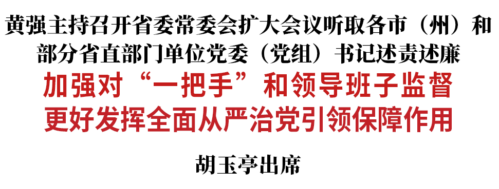 为深入贯彻落实《中国共产党党内监督条例》和《党委(党组)落实全面从严治党主体责任规定》,今天(12月26日),省委书记黄强主持召开省委常委会扩大会议,听取2024年度各市(州)和部分省直部门单位党委(党组)书记述责述廉。黄强强调,要进一步加强对“一把手”和领导班子监督,更好发挥全面从严治党引领保障作用,以新时代党的建设新成效提振发展信心、优化发展环境、凝聚发展力量。省委副书记、省长胡玉亭出席会议。