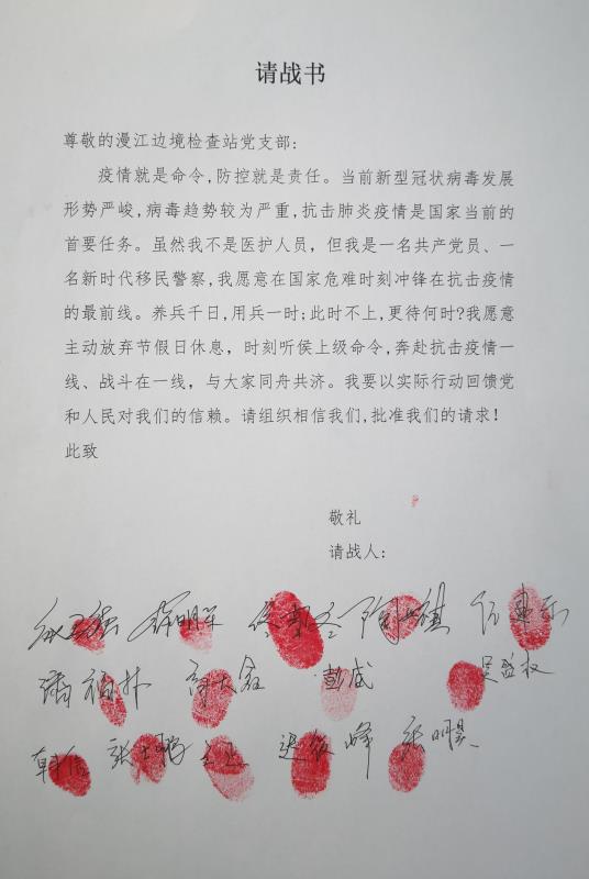 “我是党员,我愿意奔赴抗击疫情一线、战斗在一线!”这是吉林白山边境管理支队抚松边境管理大队漫江边境检查站党支部14名党员民警在“请战”书上写下的铮铮誓言。