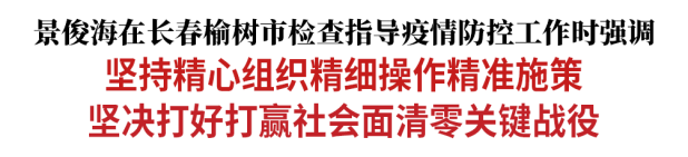 3月22日,省委书记景俊海到长春榆树市,实地检查指导疫情防控工作,看望慰问奋战在一线的工作人员。他强调,长春各级干部要切实把思想和行动统一到习近平总书记关于疫情防控的重要讲话重要指示精神上来,按照孙春兰副总理部署要求,坚持精心组织、精细操作、精准施策,咬紧牙关、一鼓作气,坚决打好打赢社会面清零关键战役,为决战决胜疫情防控硬仗奠定坚实基础。