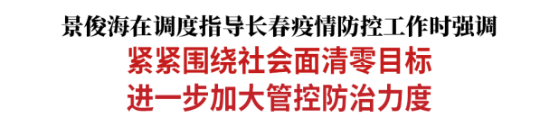 景俊海先后与长春市及下辖各县(市、区)、开发区视频连线,听取疫情防控进展情况,对社会面清零工作进行再安排、再部署。他指出,实现社会面清零目标,是长春疫情防控保卫战的关键战役,必须全面动员、迅速行动、坚决打赢。要在24小时内完成高质量全员核酸检测,有序组织好采、送、检、报各环节,扎实开展“敲门行动”“扫地行动”,逐户逐门敲门找人,切实查到每一户、每一人,做到应检尽检、不漏一人。要同步推进流调溯源和隔离转运,迅速把阳性感染者转运到定点医院、方舱医院,把密接人员转运到集中隔离点,坚决做到即查即转、日清日结。要按照国家规定动态调整封控区、管控区,该封控的小区坚决封控,该管控的小区彻底管住,开放式小区要上围栏、用硬隔离,确保静态管控措施落到实处。要全面排查建筑工地等人员密集场所,采取严密措施,及时消除隐患,坚决防止发生聚集性疫情。要加强校园内部管理,抓好校园环境监测和消杀,确保校园绝对安全。医护人员、检测人员要闭环管理、定点居住、定区活动,坚决防止风险外溢。要扎实做好保民生、兜底线、救急难各项工作,市场保供人员要实行闭环管理,每日进行核酸检测,强化个人防护,合理规划路线,做好环境消杀,严格限制活动范围,最大限度减少流动。