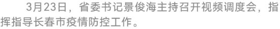3月23日下午,省委书记景俊海主持召开视频调度会,指挥指导长春市疫情防控工作。景俊海强调,长春各级领导干部要切实把思想和行动统一到习近平总书记关于疫情防控的重要指示精神上来,按照孙春兰副总理部署要求,坚持真抓实干、科学精准,紧紧围绕社会面清零目标,进一步加大管控防治力度,为打赢疫情防控硬仗提供坚强有力支撑。