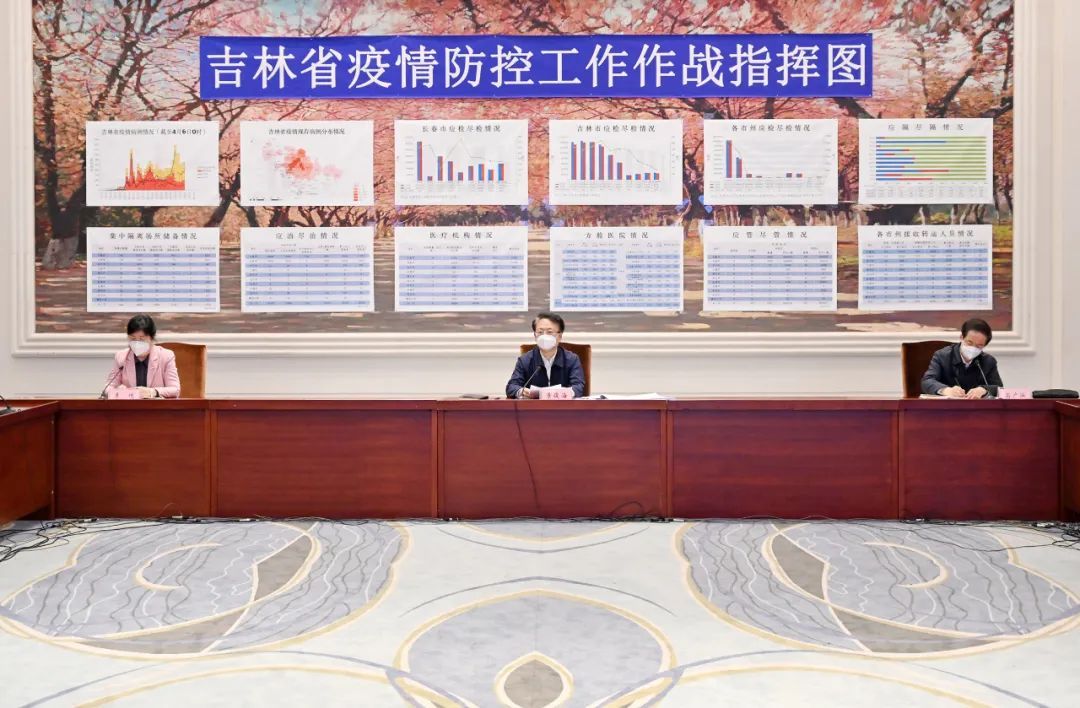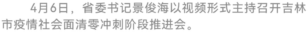 4月6日,省委书记景俊海以视频形式主持召开吉林市疫情社会面清零冲刺阶段推进会。他强调,要深入贯彻习近平总书记关于疫情防控的重要指示精神,按照孙春兰副总理部署要求,坚定不移执行“动态清零”总方针,精神再振奋、责任再落实、行动再提速,采取更加有力有效措施,一鼓作气实现社会面清零目标。省委副书记、省长韩俊出席会议。