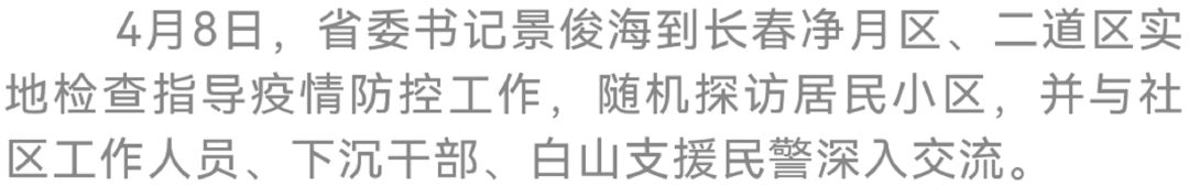 4月8日上午,省委书记景俊海来到长春净月高新技术产业开发区、二道区,实地检查指导疫情防控工作,分别主持召开汇报会,详细了解疫情防控进展和包保支援工作情况。他强调,要深入贯彻习近平总书记关于疫情防控的重要讲话重要指示精神,按照孙春兰副总理部署要求,坚持快、准、严、细、实,不折不扣落实各项防控措施,咬紧牙关、争分夺秒、一鼓作气、务求必胜,坚决完成社会面清零目标任务。