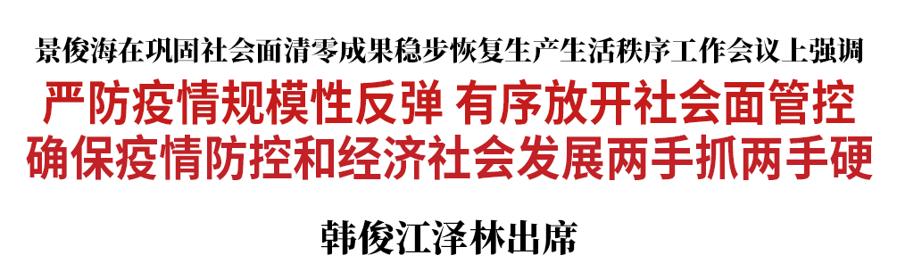 景俊海指出,经过艰苦鏖战,吉林市、九台区已经实现社会面清零,长春市疫情得到有效遏制,全省疫情防控工作取得阶段性成果。全省各级党委、政府必须进一步增强责任感紧迫感,以更快速度、更硬举措、更实作风,奋力夺取疫情防控斗争最终胜利。长春市要夯实作战主体责任,集中精力打好“清仓见底”歼灭战、“清盲扫漏”主动战、“清污除毒”预防战,紧盯宽城、绿园、经开、南关等重点区域集中攻坚,尽快实现社会面清零目标。吉林市要严格落实“四早”措施,加大环境消杀力度,分区分级分类有序放开社会面,坚决守住疫情防控成果。白城市要严格落实管控措施,以最快速度扑灭疫情。省内其他没有疫情地区要完善常态化疫情防控措施,坚决杜绝简单化、一刀切、层层加码、一封了之等过度防疫行为,最大限度减少疫情对经济社会发展影响。