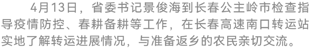 景俊海非常关心农民回乡转运工作。他分别来到长春高速南口和范家屯高速口转运站,实地察看转运进展情况,详细了解中转分流流程,并与准备返乡的农民亲切交流,叮嘱大家遵守防疫规定,加强个人防护,及时做好土地平整、农资采买等准备工作,确保春耕按时序顺利进行。景俊海要求长春市与各地搞好对接配合,严格移动闭环管理,点对点平安转送回家,确保人员信息准确、接送及时、无缝衔接。省直有关部门要着力打通人员返乡和农资运输堵点,开通咨询求助热线,帮助农民解决实际问题,千方百计保障农时一天不耽误、农户一户不落下、田地一亩不撂荒。