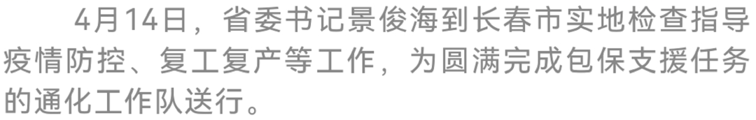 4月14日,省委书记景俊海到长春市,实地检查指导疫情防控、复工复产等工作。他强调,要深入贯彻习近平总书记关于疫情防控的重要讲话重要指示精神,按照孙春兰副总理部署要求,科学精准落实防控措施,稳步有序推进复工复产,坚决夺取疫情防控和经济社会发展双胜利。