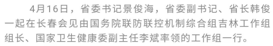 4月16日,省委书记景俊海在长春为援助吉林的国务院联防联控机制综合组吉林工作组部分成员、河南省医疗队送行,代表省委、省政府,向他们为吉林抗疫作出的巨大贡献致以衷心感谢和崇高敬意。