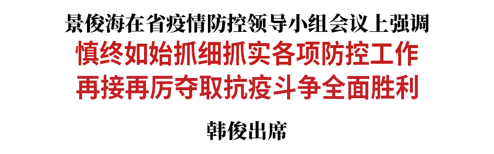 景俊海指出,当前,我省疫情防控已经进入巩固成果、动态清零、逐步恢复生产生活秩序的新阶段。各级党委、政府和广大党员干部要始终牢记“国之大者”,在工作中要有“时时放心不下”的责任感,绷紧弦、不松劲,坚决做到防住疫情、稳住经济、安全发展。一要持之以恒压紧压实责任,各级党委、政府要进一步完善防控措施和应急预案,切实做到有组织、有队伍、有资源、有行动;各行业主管部门要科学指导、加强监管,抓紧抓实政策落实、闭环管理等工作;各单位要严格落实核酸检测、环境消杀、健康监测等措施。二要毫不放松抓好攻关收尾工作,全力做好医疗救治,尽早实现在院患者全部治愈出院;全力加强封控区、管控区管理,按照规定科学解除管控;全力做好集中隔离点管理,严防发生人员聚集等行为;全力做好环境消杀,确保重点场所、公共场所全覆盖、无死角。三要慎终如始做好常态化疫情防控,保持快准严细实要求不变、各环节规范要求不变、防疫人员责任要求不变,坚持早发现、快处置、强引导,进一步强化发热门诊、药店、社区等哨点监测作用,对社会面新发现疫情要第一时间开展流调溯源、隔离管控、转运收治等工作,引导居民养成良好习惯,营造群防群控、联防联控浓厚氛围。四要牢牢守住疫情防控重要关口,不断强化重点区域管制、重点场所管控、重点人群管理,加快创建无疫单位和无疫县(市、区),调动群众参与常态化疫情防控的积极性、主动性,共同筑牢社区防线。五要加快建设强大的公共卫生体系,加强核酸检测和医疗救治能力建设,进一步健全疾病预防和数据支撑体系,提升应对突发公共卫生事件水平,最大程度保护人民生命安全和身体健康。六要有序推进生产生活秩序恢复,重点加强复工企业管理,有序放活商贸服务业,因地制宜、因校制宜开展复学复课,最大限度减少疫情对经济社会发展的影响。