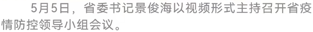 5月5日,省委书记景俊海以视频形式主持召开省疫情防控领导小组会议。他强调,要深入贯彻习近平总书记关于高效统筹疫情防控和经济社会发展的重要讲话重要指示精神,按照孙春兰副总理部署要求,坚定不移坚持人民至上、生命至上,坚持外防输入、内防反弹,坚持动态清零,慎终如始抓细抓实各项防控工作,再接再厉夺取抗疫斗争全面胜利。省委副书记、省长韩俊出席会议。