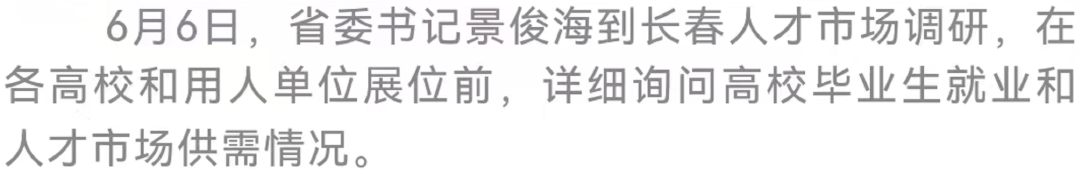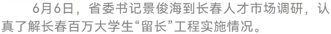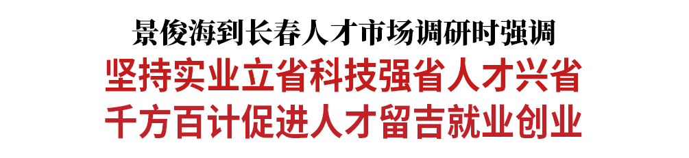6月6日,省委书记景俊海到长春人才市场调研。他强调,要深入贯彻习近平总书记关于高效统筹疫情防控和经济社会发展的重要讲话重要指示精神,认真落实中央人才工作会议部署,按照“疫情要防住、经济要稳住、发展要安全”的要求,坚持实业立省、科技强省、人才兴省,坚定不移落实就业优先战略,千方百计促进人才留吉就业创业,努力营造行行出状元、人人建功业的浓厚氛围。